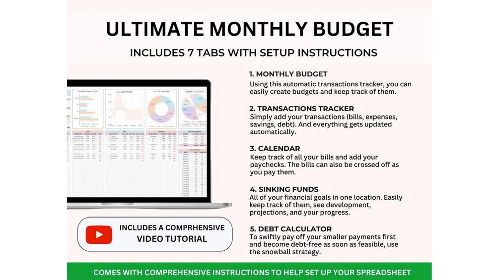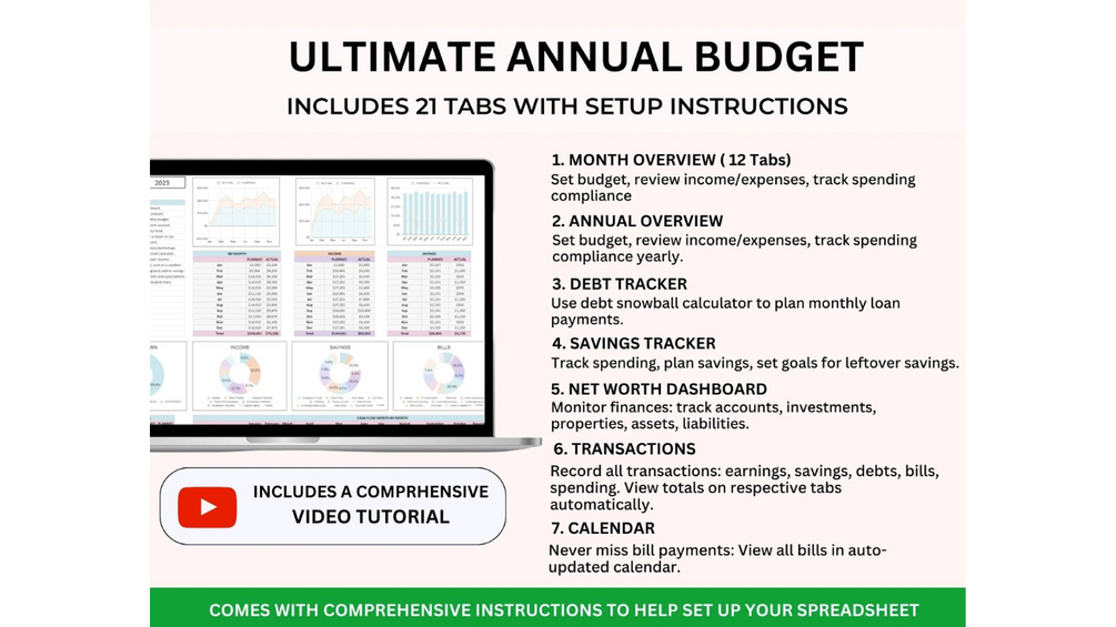 You'll get: ULTIMATE ANNUAL BUDGET ( 21 Tabs) ULTIMATE PAYCHECK BUDGET ( 7 TABS ) ULTIMATE MONTHLY BUDGET ( 6 TABS ) SMART BILL CALENDAR: ( 4 TABS ) DEBT PAYMENT TRACKER ( 5 TABS ) NET WORTH TRACKER ( 1 TAB ) SINKING FUNDS ( 1 TAB ) ❤️ BONUS EDITABLE DIGITAL BUDGET PLANNER : 70 PAGES * Financial Goals * Monthly Overview and Monthly Goals * Bi Weekly paycheck * Yearly Financial Overview * Savings Accounts Tracker * Debt Payments Tracker * Bank Account Tracker * Credit Card Tracker * Subscription Log * Password Tracker * Bill Tracker * After pay Tracker * No Spend Tracker * Custom Notes Section